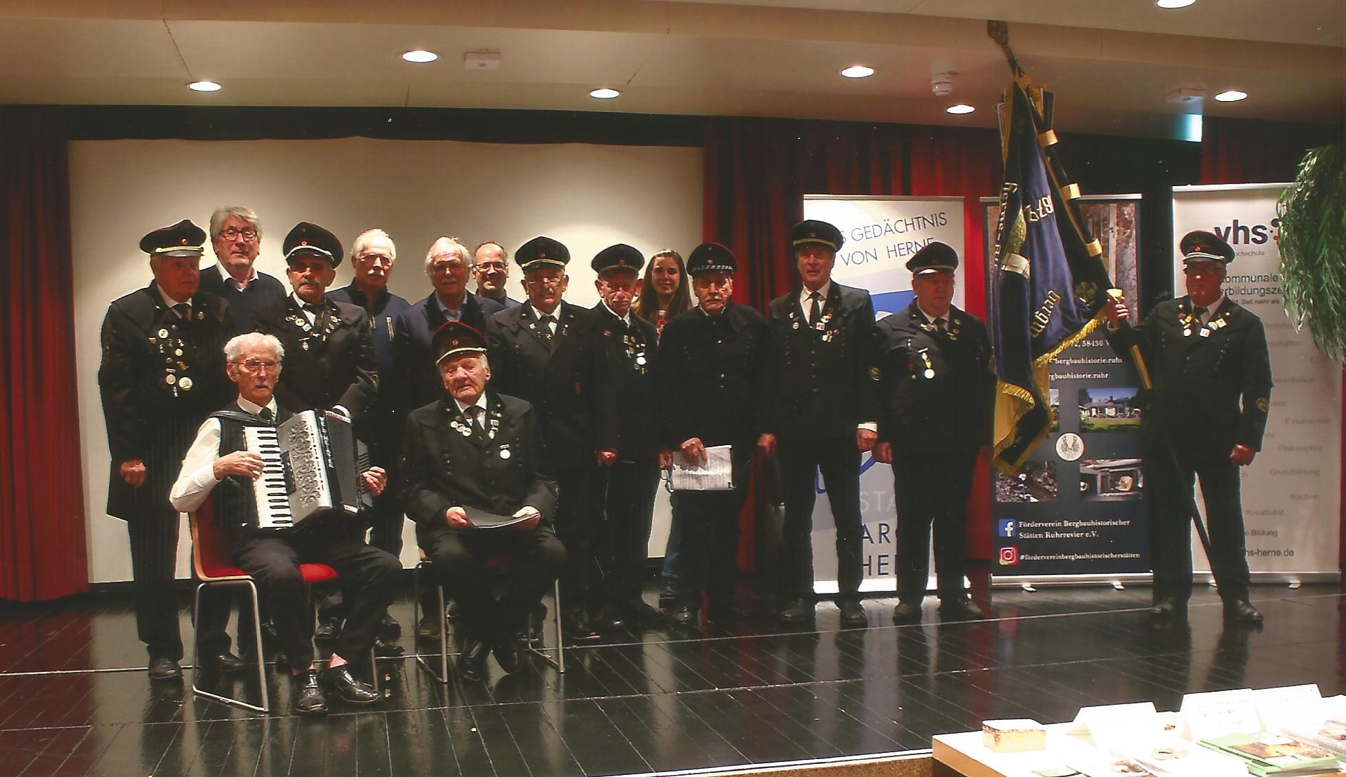Die Aktiven des 1. Herner Bergbauforums: Im Bergkittel der Chor des Bergmanns-Unterstützungs-Verein (BUV) Herne-Alt 1872 e.V., dahinter die Referenten v.l.: Uli Folta (Geschichtsgruppe „Die Vier“, Dr. Mathias Schöpel, Vorsitzender Förderverein Bergbauhistorischer Stätten Ruhrrevier e. V., Dr. Peter Piasecki, Leiter Arbeitskreis Herne im Förderverein, Jürgen Hagen, Leiter Stadtarchiv Herne, Alina Apel, Stellv. Leiterin Stadtarchiv Herne. Foto: Uli Folta, Geschichtsgruppe „Die Vier“